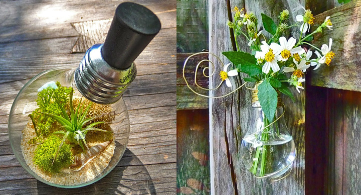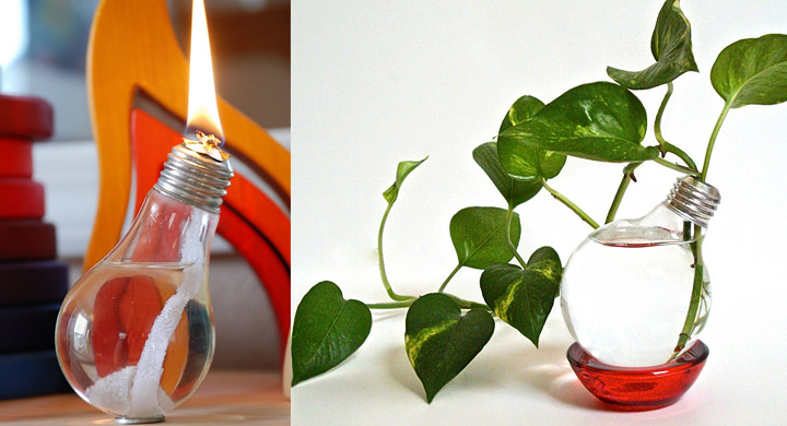 El reciclaje de bombillas es ingenio puro. Sus formas redondeadas, su material frágil pero al mismo tiempo limpio y transparente constituye una materia prima atractiva de la que podemos sacar un buen partido. Bastará con hacer saltar la chispa de la imaginación para que surjan ideas brillantes. Crear, decorar, disfrutar con los pinceles, pasarlo bien ideando algo nuevo, diferente, un resultado que sorprenda a los demás y también a nosotros mismos. Porque las bombillas viejas tienen una segunda vida que, más que práctica, sobre todo resulta decorativa, sin menoscabo del uso que pueda dársele a uno u otro objeto creado. Jarrones, lámparas, colgantes… Así es, las bombillas viejas que se han fundido o que simplemente hemos cambiado por otras de bajo consumo tienen un gran potencial para seguir iluminando nuestro hogar, esta vez sin gastar energía eléctrica ni aumentar la huella de carbono. Todo lo contario: uu brillo viene del protagonismo que adquieren al transforamarse en un delicado jarrón, en una lámpara de alcohol, en un colgante decorativo o en un simpático muñequito, entre otras muchas posibilidades eco-amigables. Los floreros son quizá la opción más popular. Basta con ver los resultados para entender que tiene todos los elementos para triunfar: sencillo de hacer (para agujerarlas necesitaremos un taladro o, manualmente, una sierra de metal y unas tenazas) y resultado fantástico, tanto individualmente como si utilizamos varias para crear un original centro de mesa o simplemente para decorar cualquier espacio de un modo realmente original. Pueden colgarse, sujetarse a una pequeña base o colocarse en la pared con fijación mural. Seguiremos el mismo proceso para hacer un mechero o lámpara de aceite: haremos el agujero e introduciremo una mecha (servirá un simple cordón de zapato) y alcohol o parafina de combustible, cuidando que queden estables para así evitar que puedan caerse y quemar algo e incluso provocar un incendio. Mucho ojito con eso.