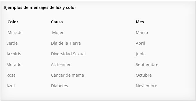 Los lugares que han decidido iluminarse permanentemente tienen una gran lista de eventos para reflejar en su iluminación, y dentro de ellos hay causas comunes que unen a los ciudadanos al rededor del mundo y es en estas ocasiones cuando la luz se vuelve protagonista social. La percepción del color se puede estudiar desde diferentes puntos de vista porque diferente es la sensibilidad de cada persona, sin embargo, hay colores con significados comunes y universales que se usan para trasmitir mensajes. Si a esto le agregamos la fascinación que tenemos por la luz, que nos lleva a seguirla, buscarla y darle significado, entonces luz y color se convierten en protagonistas de nuestras noches y comunicadores eficientes.